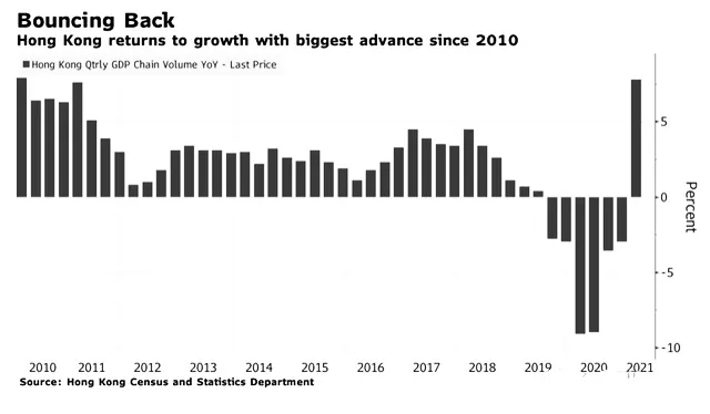 前幾日,香港政府公布,第一季經(jīng)濟按年實質(zhì)增長7.9%,較初值高0.1個百分點,結(jié)束連續(xù)六個季度收縮的情況。