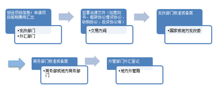 一般而言,中國企業(yè)進行海外投資,主要需要取得三個主管部門的核準、備案或登記,包括國家發(fā)展和改革委員會或地方發(fā)展和改革委員會(下稱“發(fā)改部門”)的核準或備案、商務(wù)部或地方商務(wù)部門(下稱“商務(wù)部門”)的核準或備案、以及國家外匯管理局地方分局(下稱“外管部門”)的外匯登記程序【2015年6月1日后,外匯登記權(quán)限已下放到企業(yè)注冊地銀行】。