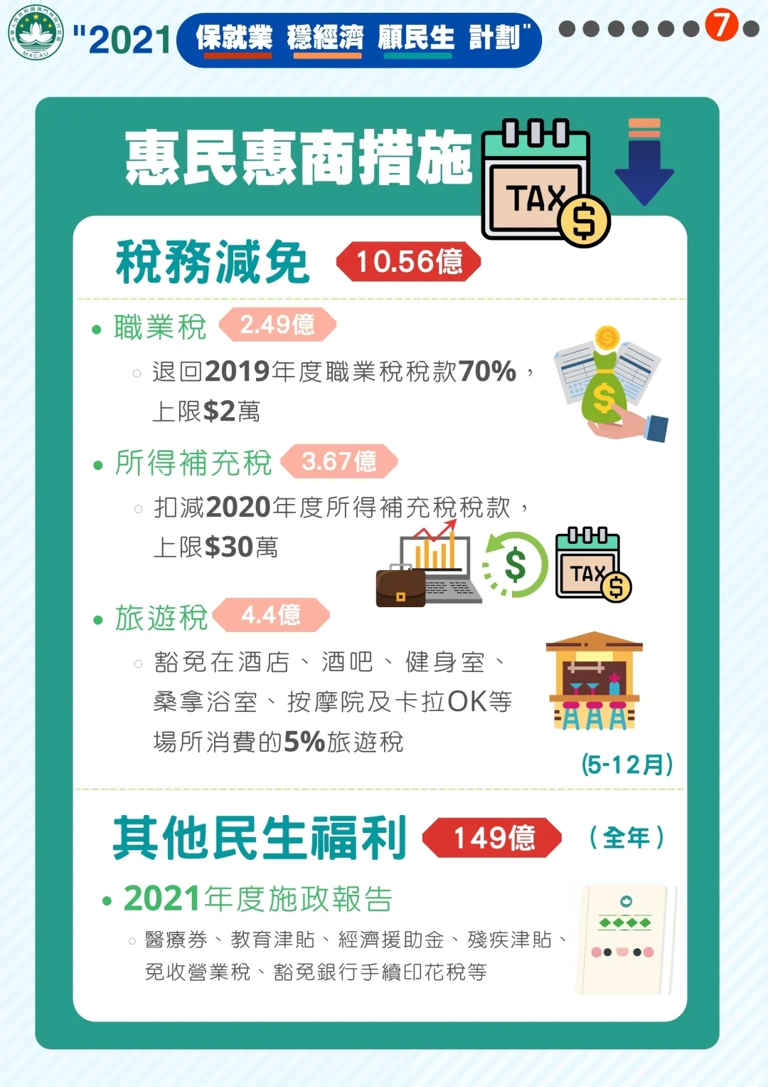 2021年度施政報告:醫(yī)療劵、教育津貼、經濟援助金、殘疾津貼、免收營業(yè)稅、豁免銀行手續(xù)印花稅等。
