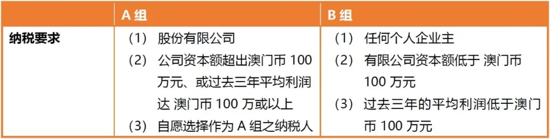 澳門承襲了葡萄牙的稅務呈交系統(tǒng),將公司劃分為兩大類別,俗稱「A 組」及「B 組」。