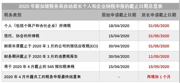 2020年4月4日,新加坡稅務(wù)局(IRAS)根據(jù)COVID-19情況的最新措施,作為對(duì)納稅人的支持,新加坡稅務(wù)局(IRAS)自動(dòng)延長(zhǎng)個(gè)人和企業(yè)納稅申報(bào)的截止日期如下: